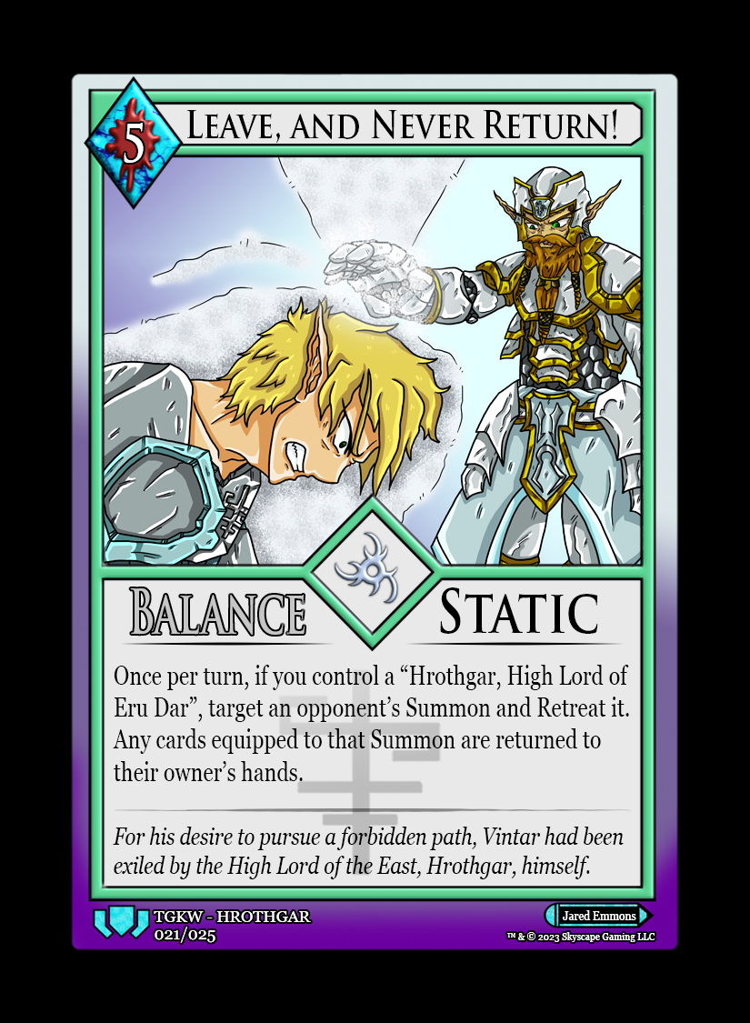 Once per turn, if you control a “Hrothgar, High Lord of Eru Dar”, target an opponent’s Summon and Retreat it. Any cards equipped to that Summon are returned to their owner’s hands.
